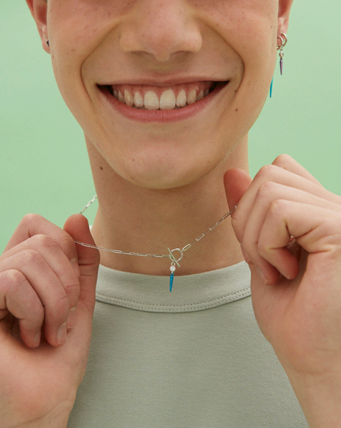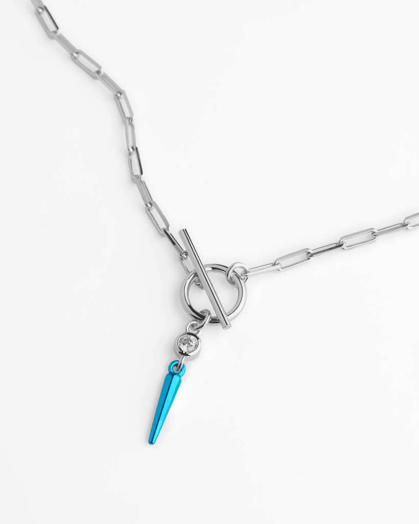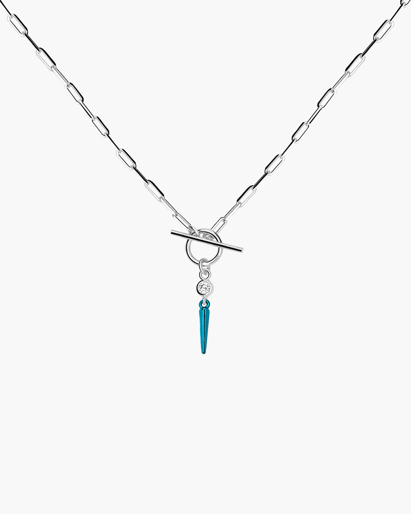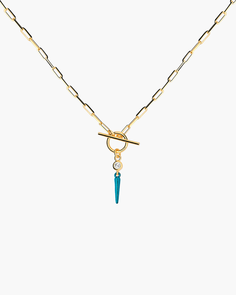 Si buscas un collar con mucho carácter que se luzca sólo y que a la vez sea el más fácil de combinar con otras piezas, lo has encontrado. Fuerza, gracia y estilo reunidos en este pincho azul colgante con cadena de plata de Ley 925 bañada en oro 18k y circonita blanca; diseñado para causar impacto.